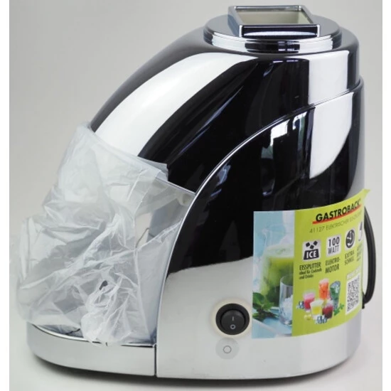 Der Gastroback Eis- Crusher 41127 lässt sich, durch sein verchromtes Gehäuse und die platzsparende Bauweise, in jede Küche integrieren und ist leicht zu reinigen. Das Zerkleinern der Eiswürfel geschieht, dank des Motors mit einer Leistung von 100 Watt, in nur wenigen Sekunden und ist somit schnell für jeden Drink oder Cocktail zubereitet. Eine Sicherheitseinwurföffnung sowie die gummierten Füße sorgen für Sicherheit im Umgang mit dem Gerät. Lieferumfang: Eisschaufel Eigenschaften: Verchromter Ice-Crusher im modernen Design, Kunststoffgehäuse, Ein- / Ausschalter, produziert ideale Eissplitter für Cocktails und Drinks in nur 15 Sekunden, abnehmbarer durchsichtiger Eisbehälter Sicherheitseinwurföffnung mit Abdeckung