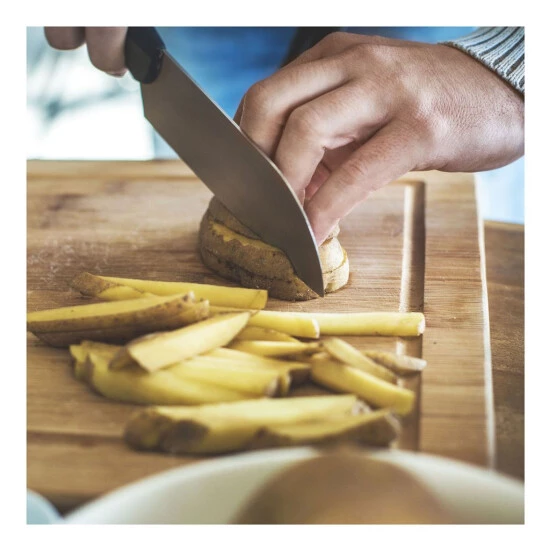 | Kartoffeln in schmale Streifen schneiden | Mit der -Funktion überschüssiges Fett herauszentrifugieren lassen | Lecker und mit 60% weniger Fett servieren |