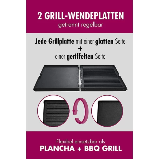- Zwei professionelle Grill-Wendeplatten aus massivem Alu-Druckguss, getrennt regelbar in 6 Stufen von 90° bis 240°C max +/- 10°C