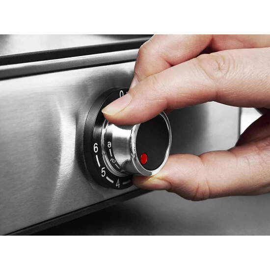 Zwei professionelle Grill-Wendeplatten aus massivem Alu-Druckguss, getrennt regelbar in 6 Stufen von 30° – 250° C max +/- 10° C. Glatte Plancha-Grillfläche perfekt für mediterrane Grillrezepte, Fischfilets, Meeresfrüchte oder Gemüse und auch für Pancakes, French Toast, Bacon, Spiegelei, Omelett, Bratkartoffeln geeignet. Geriffelte BBQ-Grillfläche für eine feine Zeichnung des Grillguts, ideal für Fisch, Steaks, Burger und Würstchen