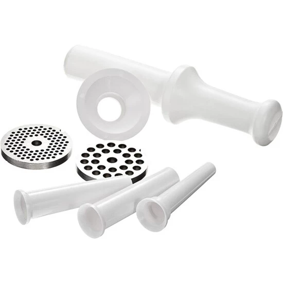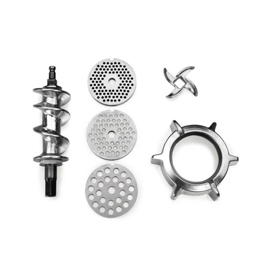 Edelstahlvorschneider mit 4 Flügeln, Einfüllschale, Schneckengehäuse und Schnecke aus Aluminium, Vor- und Rücklauf, Frontblende aus Edelstahl, Kebbevorsatz, 3 Wurstfüllvorsätze, 69 mm Scheibendurchmesser, 3 Lochscheiben (3,5/ 5/ 8 mm), 30 Min. Dauerbelastung